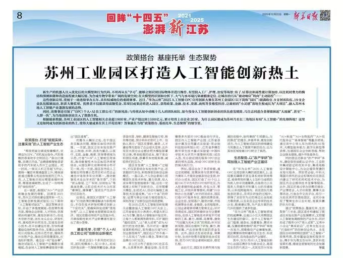 12月22日,《新華日報(bào)》聚焦蘇州工業(yè)園區(qū),“政策搭臺 基座托舉 生態(tài)聚勢”,打造人工智能創(chuàng)新熱土。
