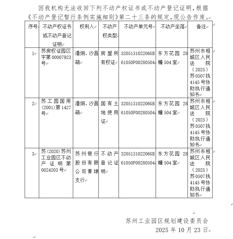 不動產權證書/登記證明作廢公告蘇園 證廢字2025(0169)號(東方花園28幢504室)