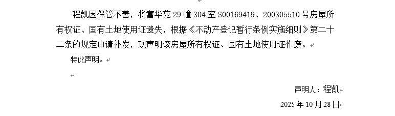 關(guān)于富華苑29幢304室S00169419、200305510號(hào)房屋所有權(quán)證、國(guó)有土地使用證遺失聲明