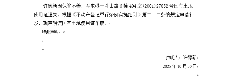 關于東港一斗山路6幢404室(2001)27852號國有土地使用證遺失聲明
