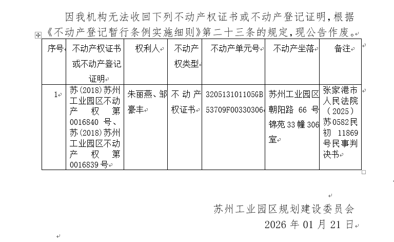 不動產(chǎn)權(quán)證書/登記證明作廢公告蘇園 證廢字2026(0010)號(錦苑33幢306室)