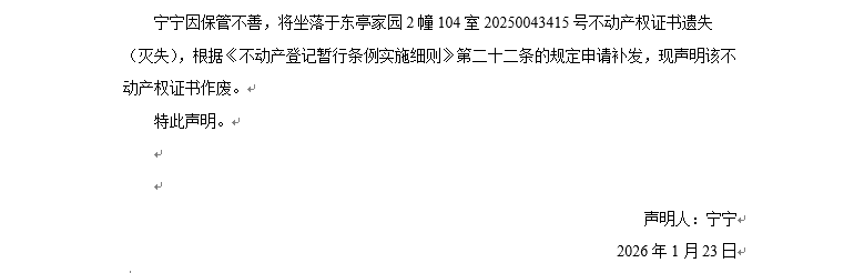 關于東亭家園2幢104室20250043415號不動產權證書遺失聲明