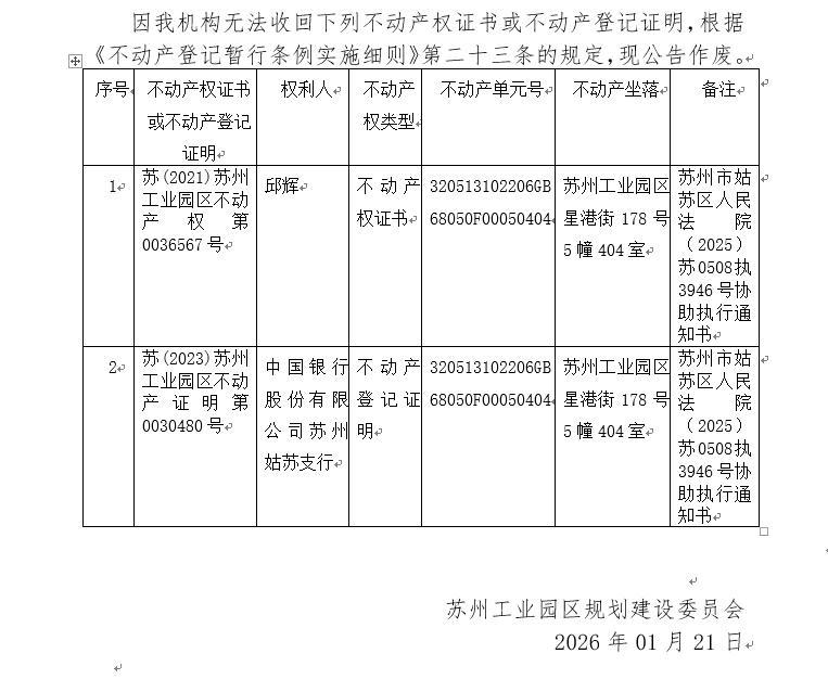 不動產權證書/登記證明作廢公告蘇園 證廢字2026(0008)號(蘇州工業園區星港街178號5幢404室)