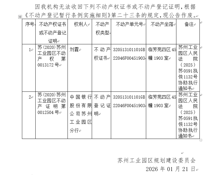 不動產權證書/登記證明作廢公告蘇園 證廢字2026(0014)號(臨芳苑四區45幢1903室)