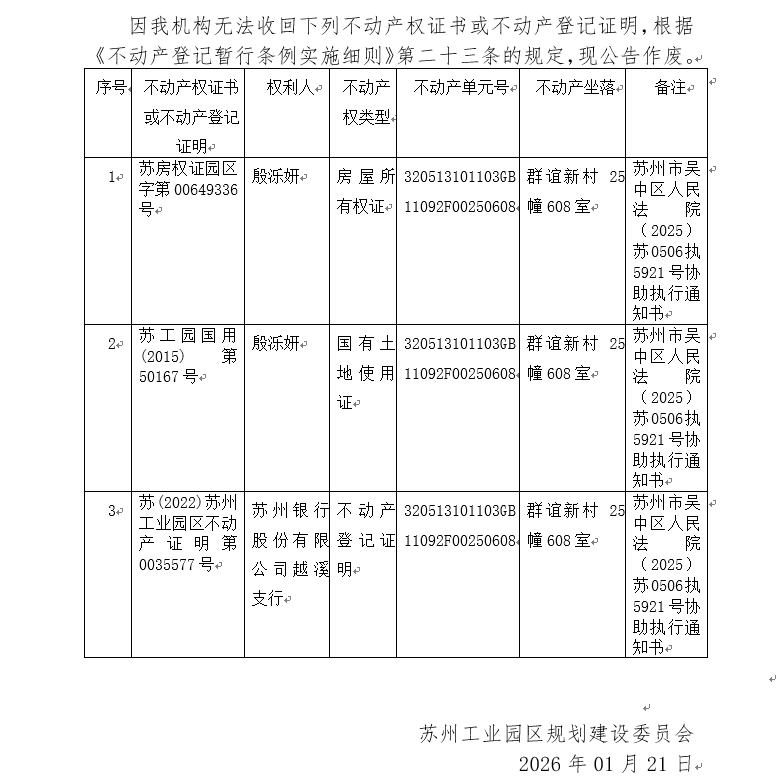 不動(dòng)產(chǎn)權(quán)證書(shū)/登記證明作廢公告蘇園 證廢字2026(0018)號(hào)(群誼新村25幢608室)