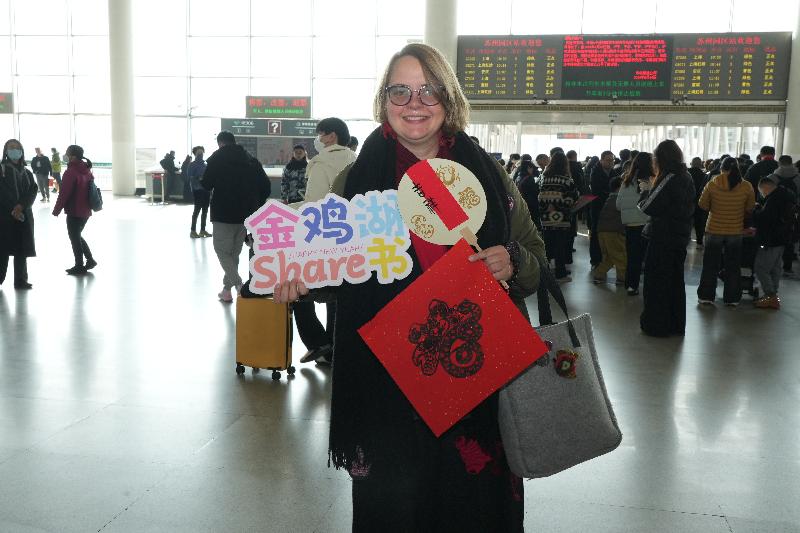 在園區公共文化中心舉辦的“非遺賀新春潮趣過大年”春風行動現場,書法、拓印等傳統文化展示體驗吸引了許多市民圍觀,Karolina Pawlik也是其中之一。“我對中國的拓印、書法很感興趣,還專門研究過。現場,工作人員演示上墨、鋪紙、拓印等環節,人們在等待制作的過程中,可以感受到非遺傳承的深厚底蘊。我能在火車站看到非遺的展示、制作,覺得非常驚喜和感動。”