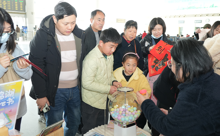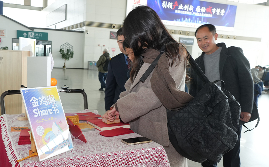 現場,玩法多樣的“金雞湖Share書”區同樣熱鬧非凡,吸引了眾多乘客駐足。扭蛋機內藏著新春福扇、徽章、文創日歷、雜志書刊等豐富獎品,大家踴躍參與,樂在其中。乘客們還可以在明信片、紅包等物品上親手蓋章,將滿滿的福氣和好運帶回家中。流動圖書車旁,不時有小朋友坐下,在車站的一隅靜靜地翻閱著書籍。