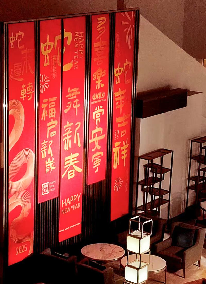 隨處可見的紅燈籠和中國結(jié),各式各樣的紅色燭臺、蛇年布偶,寓意著吉祥圓滿的裝飾品,紅紅火火的許愿墻……不少酒店換上蛇年“新裝”,酒店里的春節(jié)氛圍十分濃厚。