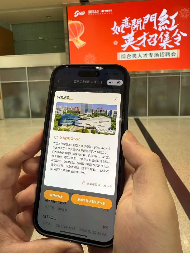 2025年,園區(qū)人才市場在而立之年迎來煥新登場,軟硬件設(shè)施全面升級,利用最新數(shù)字化手段實(shí)現(xiàn)招聘信息即時交互?,F(xiàn)場崗位信息與手機(jī)實(shí)時互聯(lián),發(fā)現(xiàn)心儀職位可同步生成AI自動推薦,一鍵觸達(dá)、轉(zhuǎn)發(fā),“呼朋喚友”共赴一場春風(fēng)之約。
