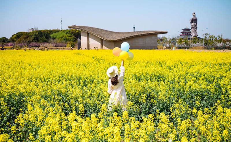 這個清明小長假,草鞋山考古遺址公園內(nèi)近20畝的油菜花田正值花期,簇簇小花“浮”在綠云之上,肆意綻放田間,一片絢爛金黃,釋放著春的生機與活力。