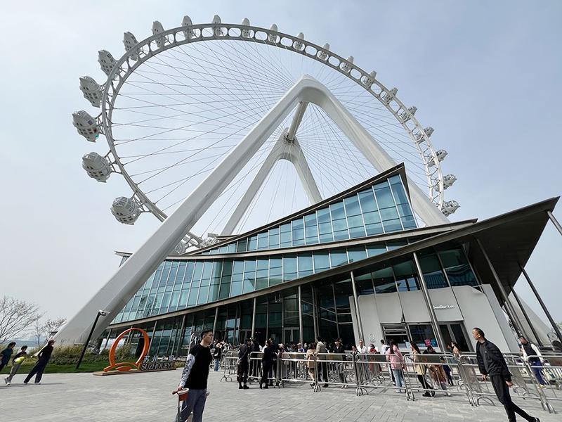 不遠處,“蘇州之眼”摩天輪也在春光里“玩轉(zhuǎn)”城市的極致浪漫。作為亞洲最大的水上摩天輪,“蘇州之眼”高128米,共設(shè)有28個全景轎廂,每個轎廂可容納25人,旋轉(zhuǎn)一圈約30分鐘,可360°俯瞰金雞湖及園區(qū)乃至蘇州全景。