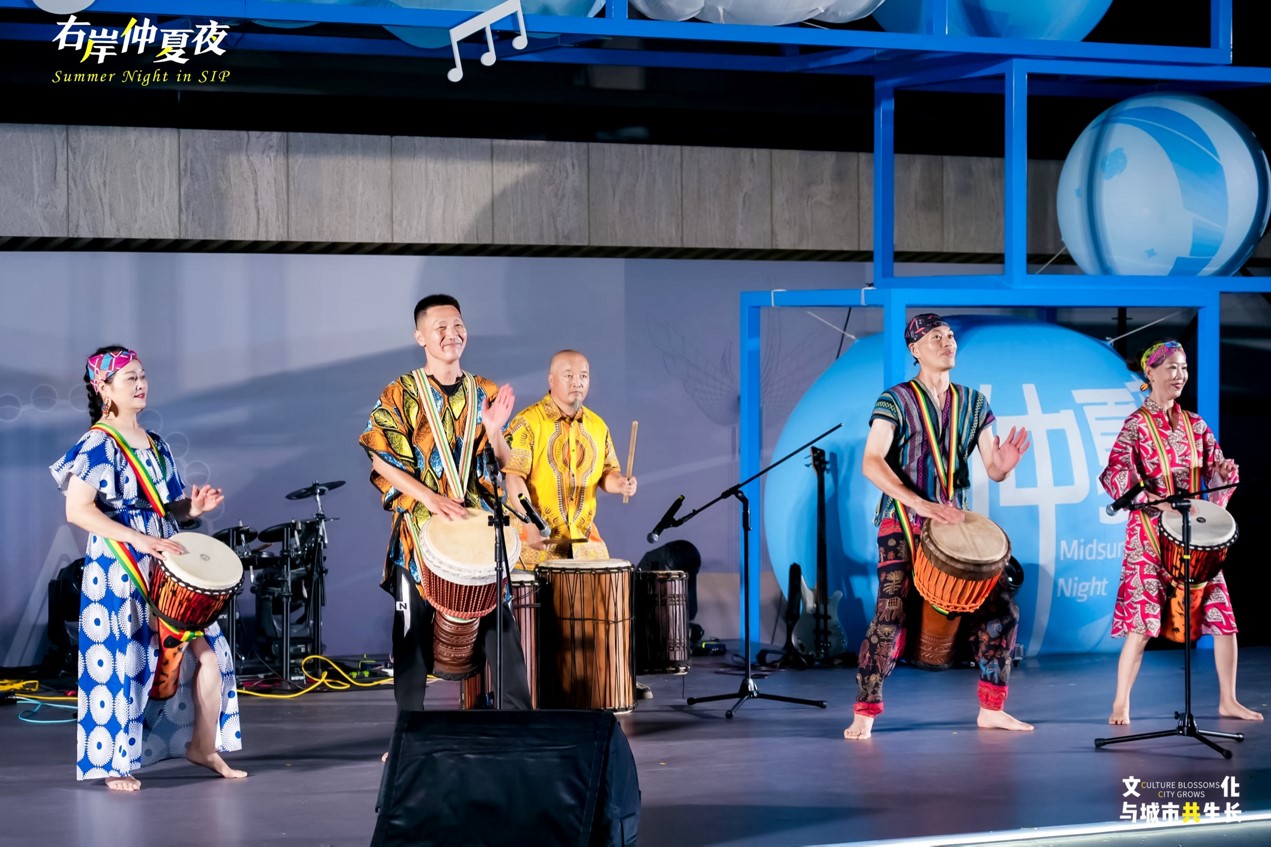 以夏夜星空為幕布,金雞湖右岸客廳今夏搭建起的開放性群眾文化舞臺,整合各界演藝資源,外籍友人、企業高管、本土藝術家等多元主體擔綱舞臺主角,為園區市民和藝術愛好者常態化推出“藝術盲盒”快閃演出?,F場,鼓文化藝術館的非洲鼓率先擂響,激昂鼓點如夏夜驟雨,瞬間點燃全場熱情,觀眾們隨著鼓點節奏互動,將氣氛推向高潮。