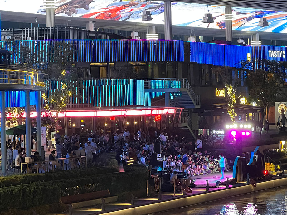 在園區(qū),藝術(shù)與人文交織的魅力夏夜并不僅限于右岸下沉式廣場(chǎng)。與“右岸仲夏夜”隔空相應(yīng),圓融天幕、月光碼頭等商業(yè)載體推出的一場(chǎng)場(chǎng)水岸音樂(lè)會(huì),也不斷聚集著人氣與商氣,呈現(xiàn)著國(guó)際化新城區(qū)別樣的煙火時(shí)尚新場(chǎng)景。