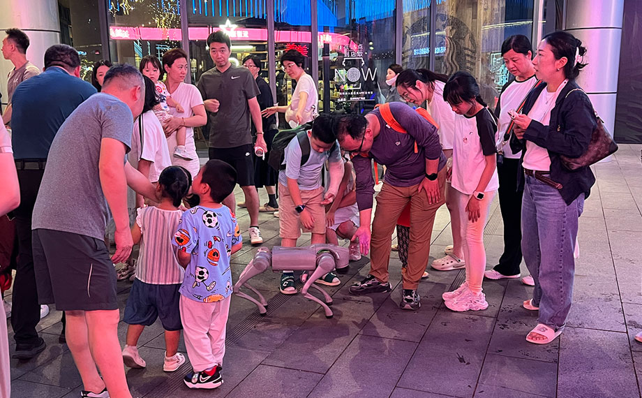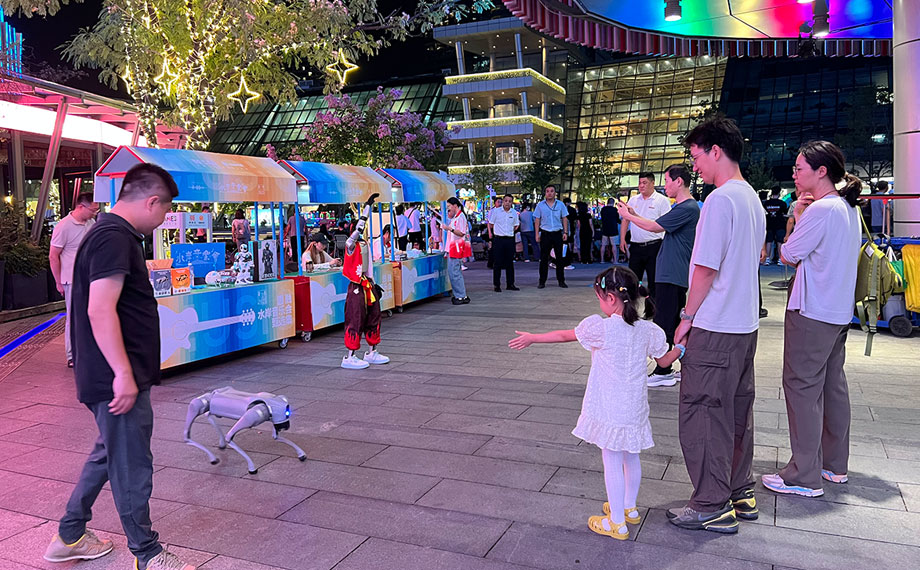 天幕下,變幻著燈光的地面噴泉讓愛(ài)玩水的萌娃樂(lè)此不疲,而臨近的水岸音樂(lè)會(huì)甄選市集上,哪吒造型的機(jī)器人、身姿靈活的機(jī)器狗也與大家握握手、跳個(gè)舞熱情互動(dòng),讓往來(lái)的大朋友、小朋友心動(dòng)不已。“水岸音樂(lè)會(huì)積聚人氣,實(shí)現(xiàn)了很好的引流,不僅提升了市民的生活質(zhì)感,也為我們企業(yè)推廣搭建了全新的場(chǎng)景。機(jī)器人正當(dāng)熱點(diǎn),我們與圓融合作,在圓融天幕和月光碼頭都設(shè)置了展臺(tái),提供機(jī)器人的表演、互動(dòng),以及配套小機(jī)器人的售賣,對(duì)于展示企業(yè)形象、能力,展現(xiàn)園區(qū)高科技活力,都是很好的平臺(tái)。”八方機(jī)器人經(jīng)理朱錦介紹說(shuō)。