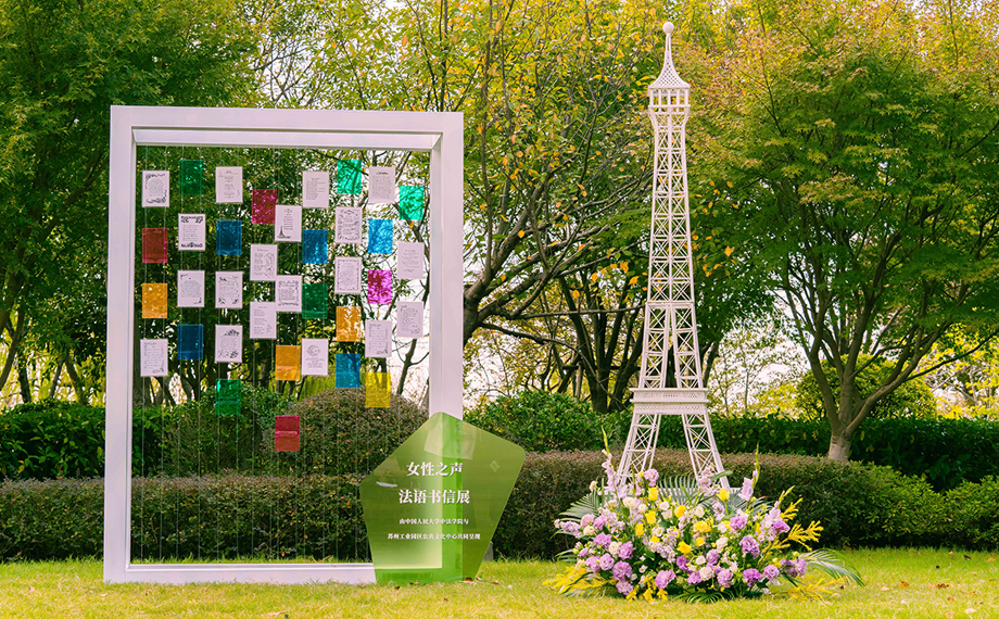 展覽區(qū)里,園區(qū)公共文化中心與中國(guó)人民大學(xué)中法學(xué)院攜手打造的“女性之聲”法語(yǔ)書信微展,用書法美學(xué)重構(gòu)法語(yǔ)語(yǔ)言魅力,將文字升華為視覺藝術(shù),呈現(xiàn)了別具韻律的線條之美。