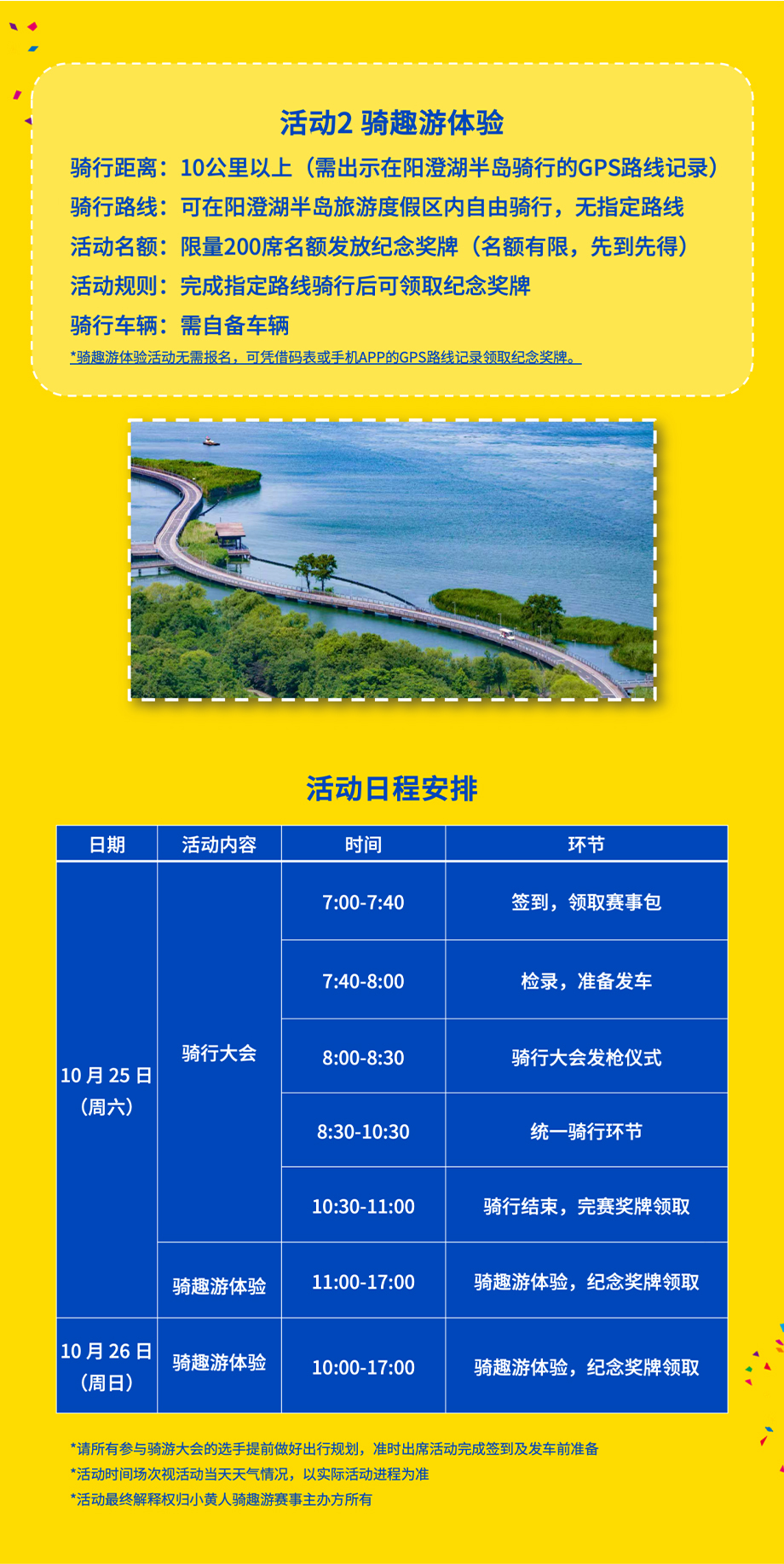 此次活動分為騎行大會、騎趣游體驗兩種形式,騎行大會需自備車輛、按照指定路線騎行,騎行距離約為10公里,參與者需年滿16周歲,完成指定路線騎行后可領取完賽獎牌,報名費用為28.8元;騎趣游體驗也需自備車輛,可在陽澄湖半島旅游度假區(qū)內自由騎行,騎行距離為10公里以上(需出示在陽澄湖半島騎行的GPS路線記錄),完成騎行后可獲得紀念獎牌(限量200席名額),該項活動無需報名,可憑借碼表或手機APP的GPS路線記錄領取紀念獎牌。