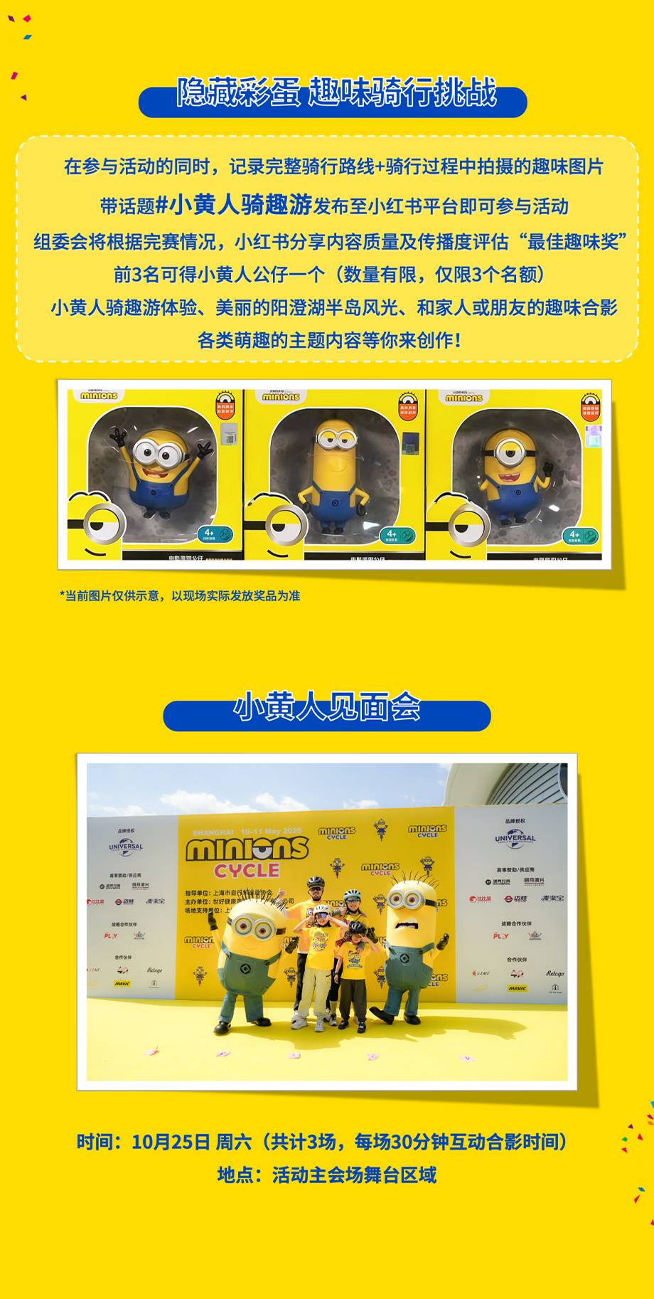 此外,在參與活動的同時,記錄完整騎行路線+騎行過程中拍攝的趣味圖片,帶話題#小黃人騎趣游發(fā)布至小紅書平臺還可參與“隱藏彩蛋趣味騎行挑戰(zhàn)”活動,后續(xù)活動主辦方將根據(jù)完賽情況、小紅書分享內容質量及傳播度評估“最佳趣味獎”,前3名可獲得小黃人公仔一個。