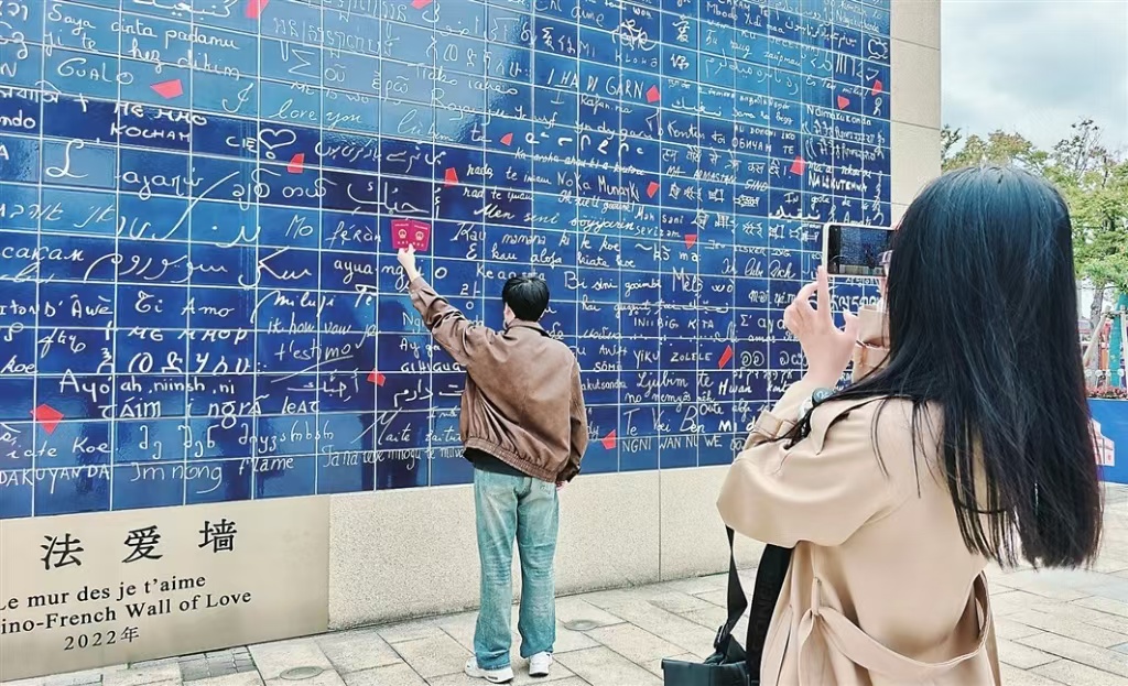 昨日,園區李公堤的中法愛墻,游客手持結婚證留影紀念,讓美麗秋日為自己的愛情作證。
