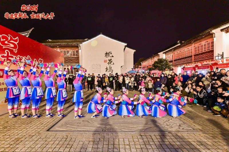 在桃花塢古色古香的背景映襯下,來自園區(qū)勝浦街道的“浦韻非凡連廂隊(duì)”隊(duì)員們也為市民游客奉獻(xiàn)了一場精彩絕倫的打連廂表演《圓融》。