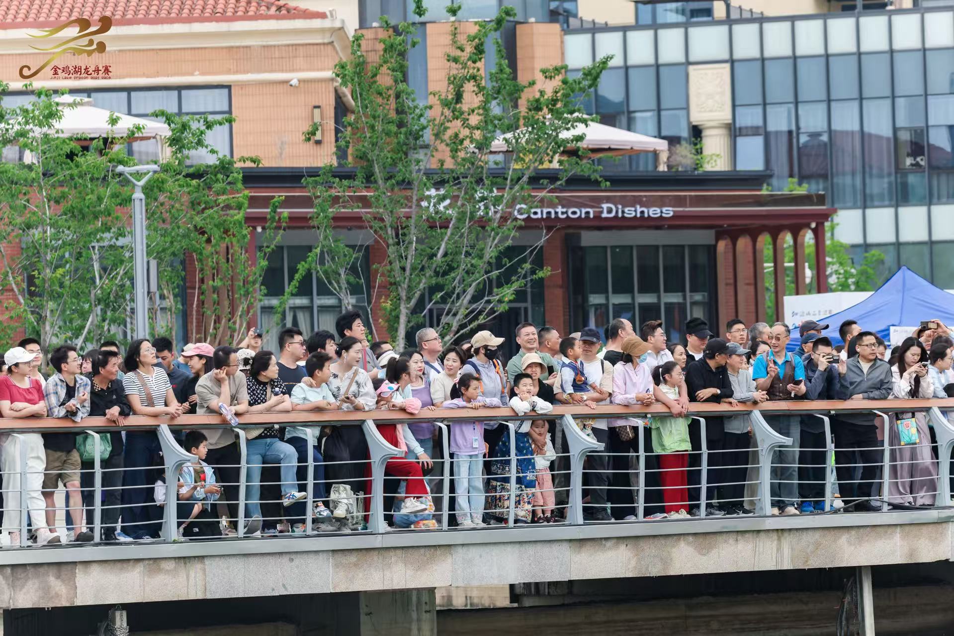 吉祥喜慶的舞龍舞獅表演,拉開今日龍舟賽的序幕。金雞湖畔的最佳觀賽視角,早早便擠滿了人。