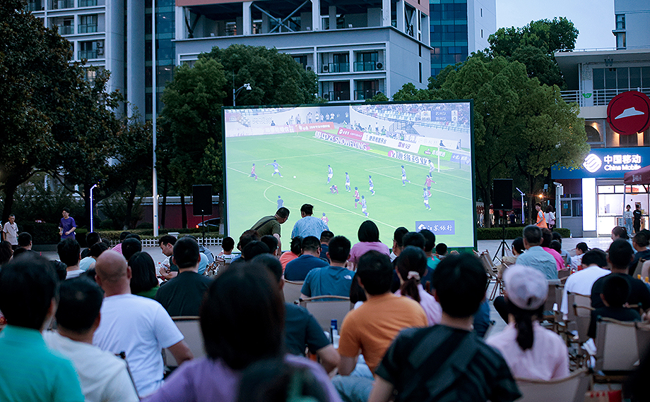 “開始了,開始了!”晚上7點(diǎn),隨著蘇州隊(duì)迎戰(zhàn)揚(yáng)州隊(duì)的哨聲響起,文星廣場(chǎng)的投影前爆發(fā)出陣陣歡呼聲。球迷們或坐或站,眼睛緊盯著屏幕上的每一次傳球、射門。每當(dāng)有隊(duì)伍發(fā)起進(jìn)攻,現(xiàn)場(chǎng)便掀起一陣聲浪。比賽開始一分多鐘,蘇州隊(duì)的率先進(jìn)球更是在現(xiàn)場(chǎng)掀起第一波高潮。