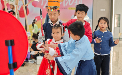 活動創新采用“中華民族探索護照”機制,打造沉浸式文化體驗平臺。孩子們手持“護照”打卡五大民族體驗區:在蒙古族區搭建蒙古包模型、體驗模擬射箭;在藏族區學習編結彩辮、品酥油茶;在維吾爾族區DIY鈴鼓、品嘗果干;在傣族區跳竹竿舞、DIY傣族帽;在漢族區體驗旗袍與書法,感受十二生肖拓印的趣味。