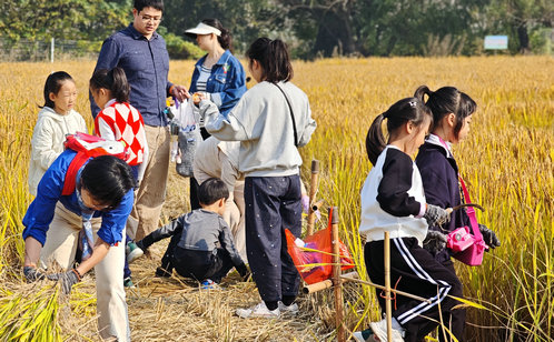 當(dāng)天中午,親子家庭在社區(qū)集結(jié)后滿懷期待奔赴農(nóng)場(chǎng)。連片金黃的稻田映入眼簾,孩子們歡呼雀躍,在老師和家長(zhǎng)的指導(dǎo)下手握稻稈、揮舞鐮刀,親身感受“粒粒皆辛苦”的勞作不易。隨后的脫粒環(huán)節(jié),伴隨谷粒噼啪落下的聲響,大家的臉上紛紛洋溢出豐收的喜悅。