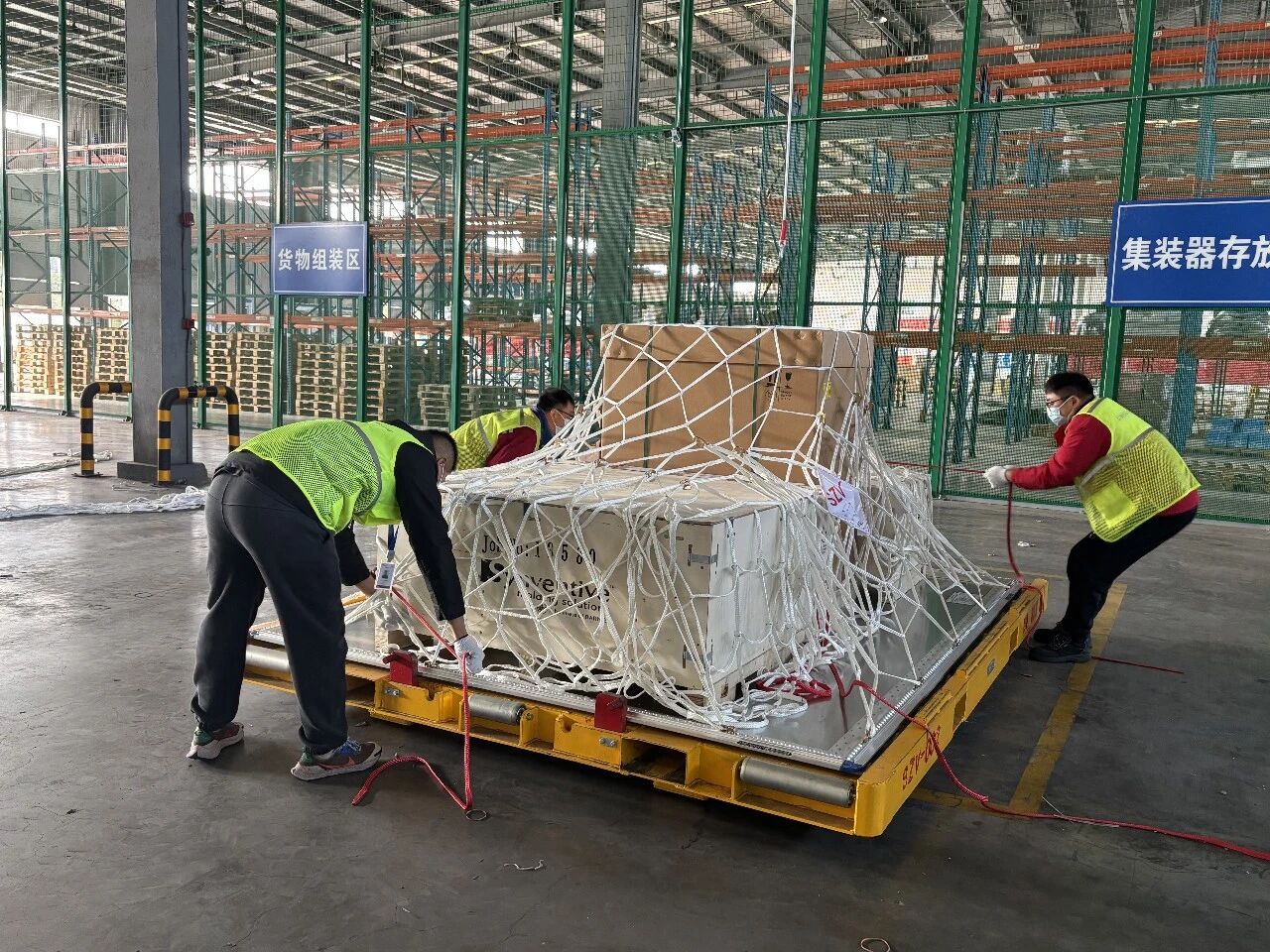 與以往不同的是,車上裝載的是蘇州前置貨站首票經(jīng)過海關(guān)全流程自動化監(jiān)管放行的貨物,它們即將搭乘當(dāng)晚阿特拉斯航空8277次和埃塞俄比亞航空3749次航班,分別飛往美國和奧地利。
