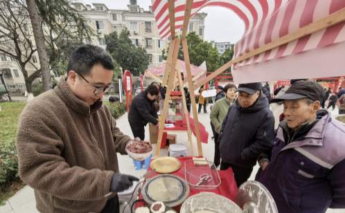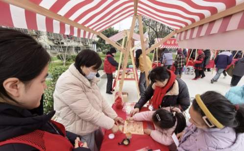 元宵集市攤位前,暖心湯圓鋪、甜蜜非遺坊、蹦爆米花機等攤位人氣火爆。居民憑集章卡免費領取熱騰騰的湯圓、海棠糕和爆米花,在品嘗傳統美食的同時,感受濃濃的節日氛圍。巧手手工閣內,志愿者帶領小朋友制作兔子燈、湯圓黏土畫,將元宵元素與環保材料結合,讓孩子們在動手實踐中理解“變廢為寶”的意義。這一環節不僅傳承了文化,更在潛移默化中培養了下一代的環保意識。