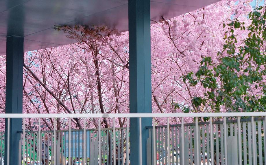 錦溪公園內(nèi),椿寒櫻開得熱烈,滿樹繁花如云似霞,白日里花影綽約,晚間夜櫻與藍(lán)調(diào)天空相映成趣,燈光勾勒花影,氛圍感十足,別有一番靜謐溫柔的景致。現(xiàn)代大道旁,新城鄰里中心門口,早櫻也盡數(shù)盛放,柔粉色花瓣隨風(fēng)輕舞,路過的行人紛紛駐足定格美好,來一場愜意citywalk,自在又舒心。