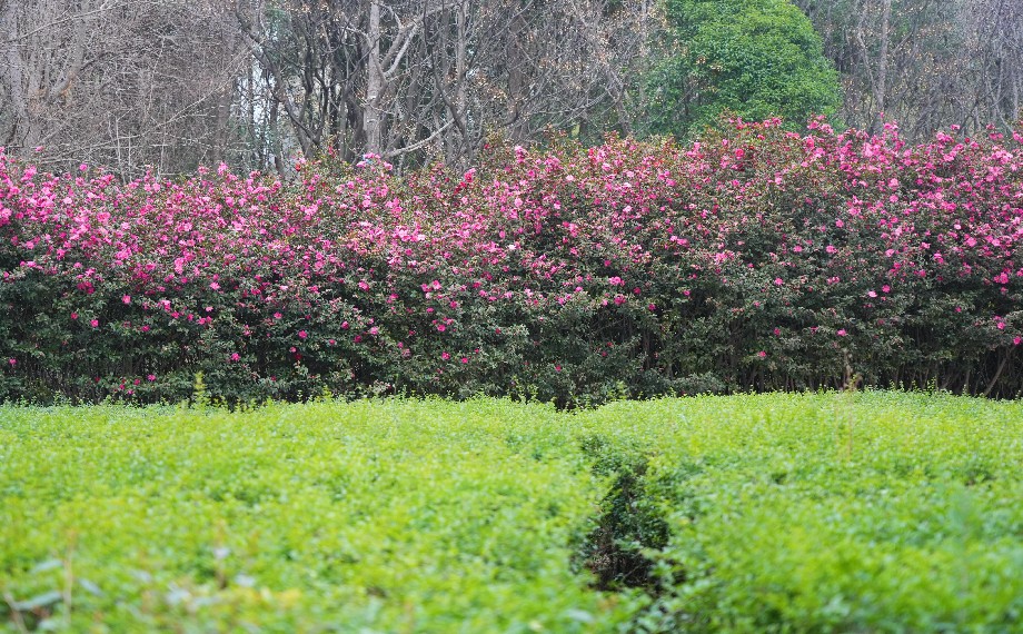 除了爛漫春花,園區(qū)的山茶花也悄然綻放,為春日添上一抹濃艷溫婉的色彩。山茶花株株挺拔,花瓣層疊舒展,在綠葉的映襯下更顯嬌艷動人。
