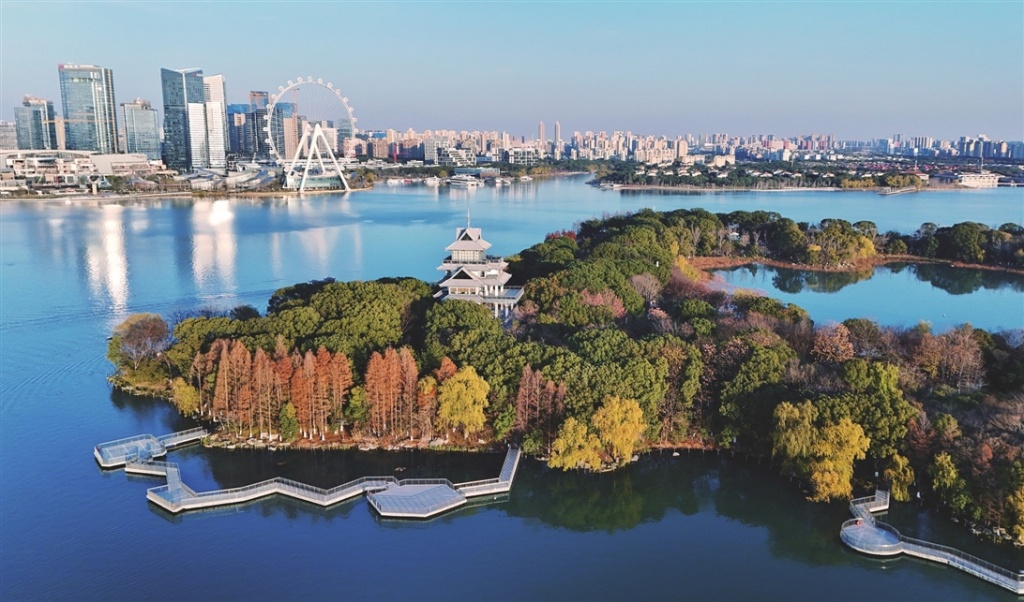 冬日的金雞湖宛如藍寶石。層林盡染的桃花島與遠處的摩天輪隔水相望,相映成景。