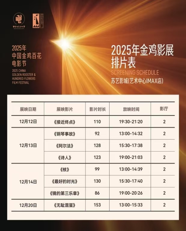 匯聚《無恥混蛋》《接近終點》《鋼琴事故》《阿爾法》《詩人》等8部國內外佳片的2025年金雞影展(蘇州站),將于12月12日至12月20日期間在中國電影金雞獎永久評獎基地——蘇州文化藝術中心蘇藝影城舉辦。以光影之名,這座誕生過諸多影史名人、名作的江南電影之城向各地影迷發出“跟著金雞游蘇州”的邀請,將一籮筐優惠“塞”進金雞影展的票根,讓它成為一把暢游蘇州的“金鑰匙”。