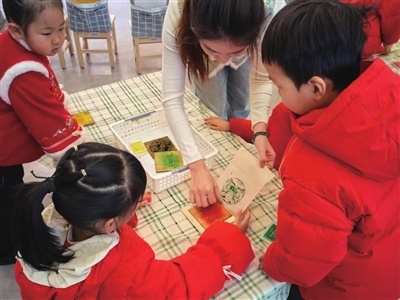 為了讓孩子們了解桃花塢木版年畫這一國家級非物質文化遺產代表性項目,蘇州工業園區錦溪幼兒園專門開設了主題課程。課程中,老師以小朋友能聽懂的方式介紹了桃花塢木版年畫的特色、制作過程等,還引導孩子通過觀察,辨認桃花塢木版年畫代表作《一團和氣》上出現的各種紋樣,說出其中的寓意。最后,小朋友們在蘇州美術館工作人員的指導下,體驗了桃花塢木版年畫的拓印環節,親手制作了屬于自己的《一團和氣》。