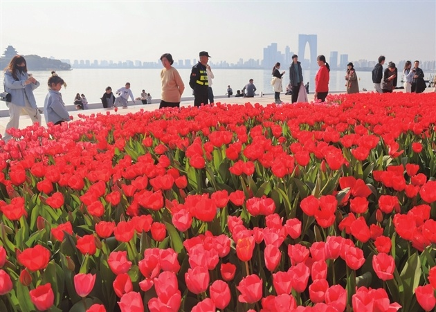 昨天,園區(qū)右岸客廳《飛翔》雕塑下,色彩艷麗的郁金香美麗綻放,吸引眾多市民目光。