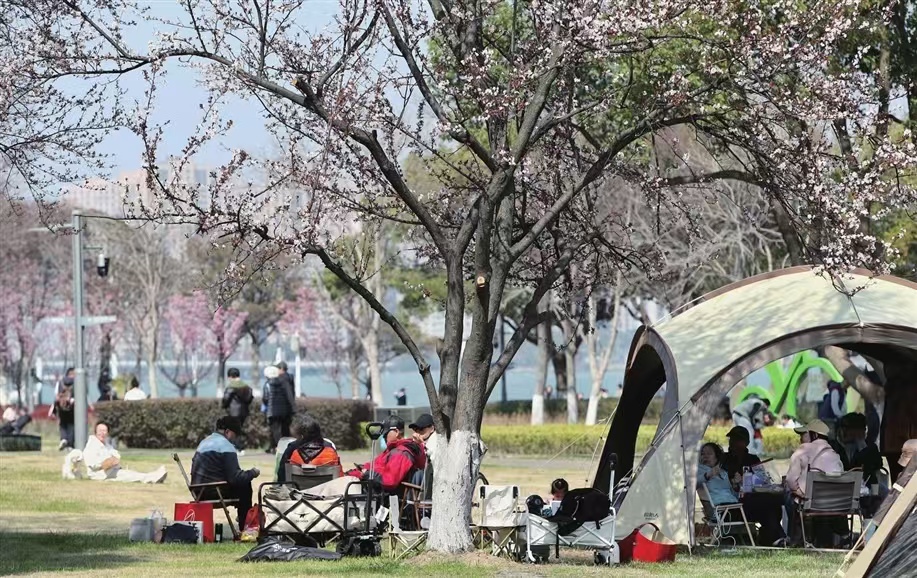 昨天,不少市民漫步戶外,感受春的氣息和愜意生活。圖為市民在園區金雞湖畔濱湖公園休閑游玩。