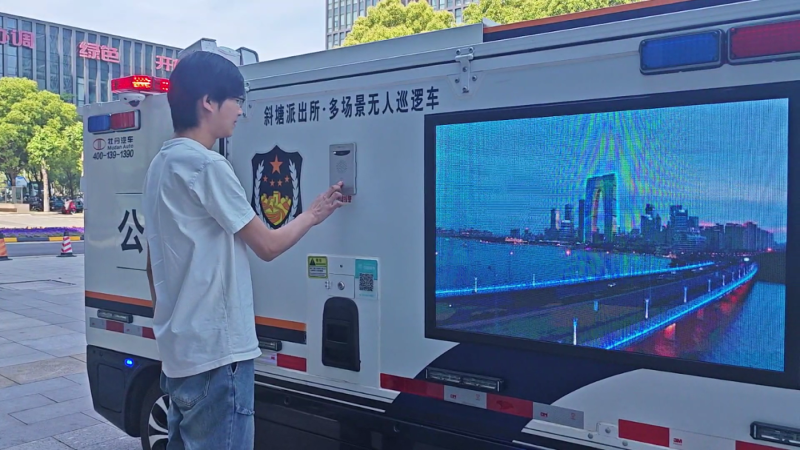 “游客朋友您好,我是園區(qū)公安智警小幺,正在執(zhí)行巡邏任務(wù),請(qǐng)注意安全。”近日,一輛藍(lán)白色的多場(chǎng)景無人巡邏車緩緩穿行在人群中,方正的車身搭載著LED顯示屏及廣播系統(tǒng),循環(huán)播放反詐宣傳等內(nèi)容,實(shí)現(xiàn)“動(dòng)態(tài)宣傳+精準(zhǔn)普法”的融合,酷颯的外觀下更是藏著滿滿的“高科技”。