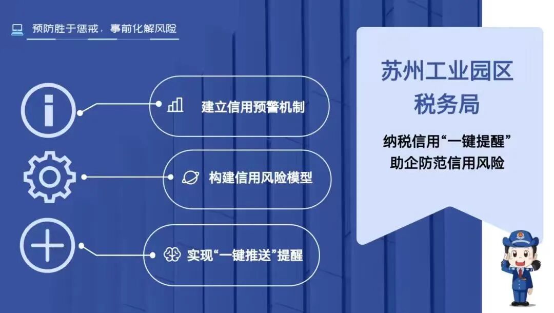 項目亮點:園區稅務局秉持“預防勝于懲戒、事前化解風險”的工作理念,針對經營主體生產經營中易出現的納稅信用失分問題,創新推出納稅繳費信用“一鍵提醒”功能,構建“流程預警-智能分析-精準推送”服務體系,實現從被動應對向主動服務的轉變,有效防范經營主體信用風險。